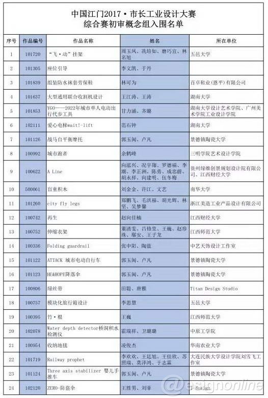 2017年7月24日,中国江门2017·市长工业设计,产品设计大赛综合赛初赛评审活动在江门市火炬创业园2号楼6楼大会议室隆重举行。经专家反复研究,后由投票的方式,最终评选出概念组229件作品,产品组65件作品,和产业组3件作品,共297件作品进入复赛。